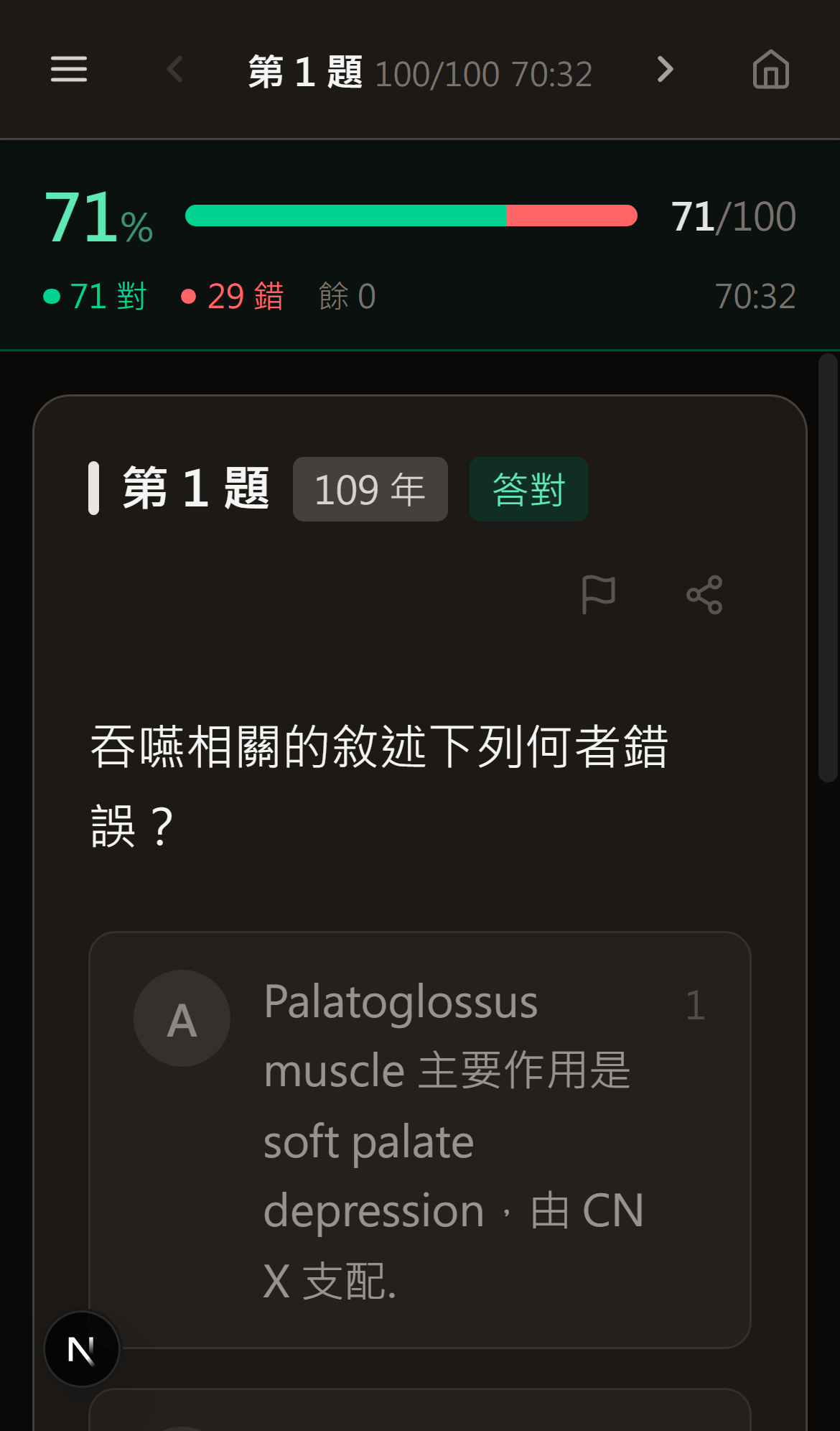 隨機抽取 100 題模擬考試,交卷即刻算分。答對答錯一目瞭然,還有色塊總覽定位弱項。